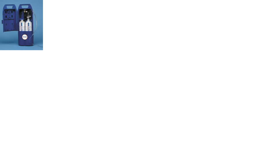 These self-contained kits are safely and easily transported. Each heavy-duty, impact-resistant plastic case may contain one or two non-refillable cylinders, one or two regulators, and appropriate tubing.